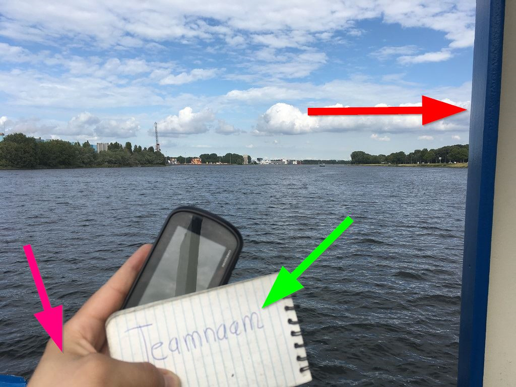 Een foto gemaakt vanaf de kade is niet acceptabel. Het is niet verplicht om in te loggen bij daglicht. Zie rode pijl in voorbeeldlogfoto. Toon een stuk van de veerboot of eigen schip op uw foto of als alternatief uw GPS-weergave die uw positie aangeeft.