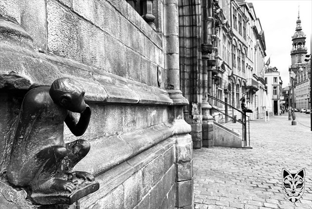 The monkey, a crouching, mischievous animal, scratching its cheek with its left hand, is placed right next to the porch of Mons town hall.