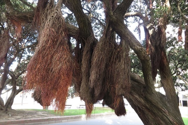 The tree can sometimes be enveloped by thick mats of aerial roots that can completely hide the bark on the trunk or the lower branches.