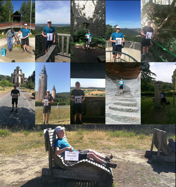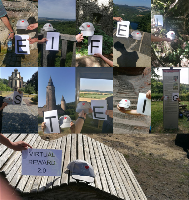 - Onderweg kom je langs de 10 WP’s. Dit zijn 10 prachtige plaatsen die je onderweg tegenkomt. Bij elk van deze WP’s maak je een foto van jezelf (of met telkens hetzelfde voorwerp) en een letter. De letters vormen in chronologische volgorde het woord ‘Eifelsteig’. Deze letters kan je afdrukken op papier, je kan ze op karton schrijven, je kan ze tonen op een tablet, … Het belangrijke is dat je de letter op de foto ziet, de letters mogen niet gefotoshopt worden! Enkele WP’s bevinden zich op een uitzichttoren. Het is leuk als je deze foto’s op de torens maakt, maar je mag ze ook beneden aan de toren maken als je er niet op wil.
