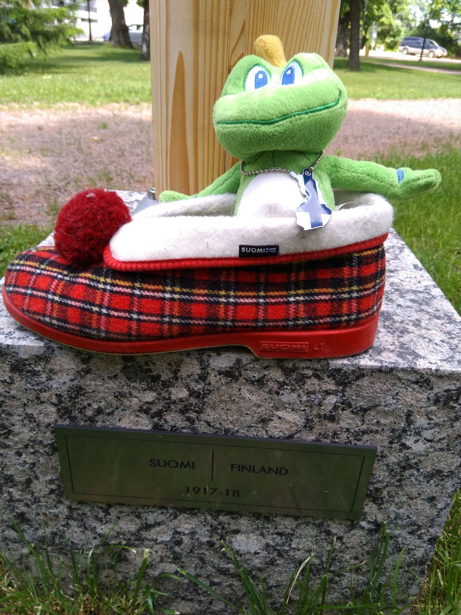 The coordinates points to the start of the Path. To log the cache as found take some item that you think describes what it is to be finnish or if you want, something that describes what it is to be from where ever you come of from should you not consider yourself to be finnish. We picked Aino slipper and inside it is our traveller Vappu the Frog that visits virtual caches. Take and add your log a picture where your item is in one of the following situations: