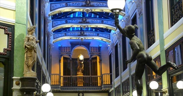 The gallery is divided into two sections, joined by a central square, where a statue of Mercury, god of commerce, rests under a beautiful glass dome. In the corners you can see 4 sculptures that represent the four seasons. The ceilings are adorned with paintings that represent mythological themes and plant motifs..