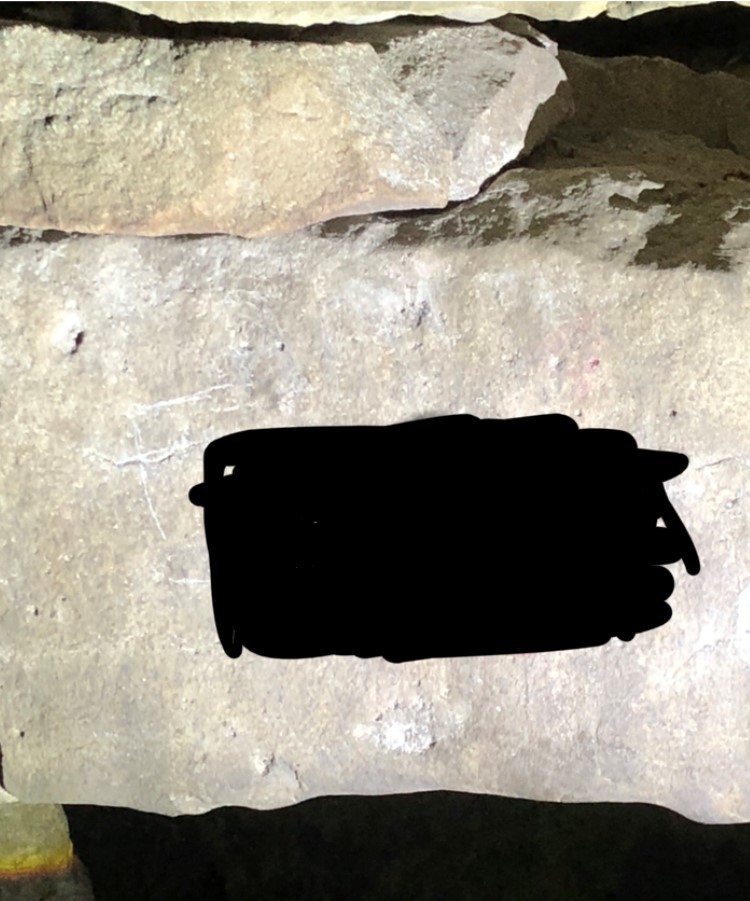Task 3 : Enter Cairn K. Take your time and enjoy the space formed by our ancestors some 5,000 years ago. You are now standing in a space which was created before Newgrange, before the Great Pyramids and well before that youngster at Stonehenge. You are looking at stones that were placed by neolithic people. Facing the back of the tomb, look at the lintel stone (horizontal stone above the opening) above the rear chamber entrance and find the large letters that someone has graffitied on the stone with thin scratches. The picture that follows shows the first letter "F" - what three letters immediately follow the F?