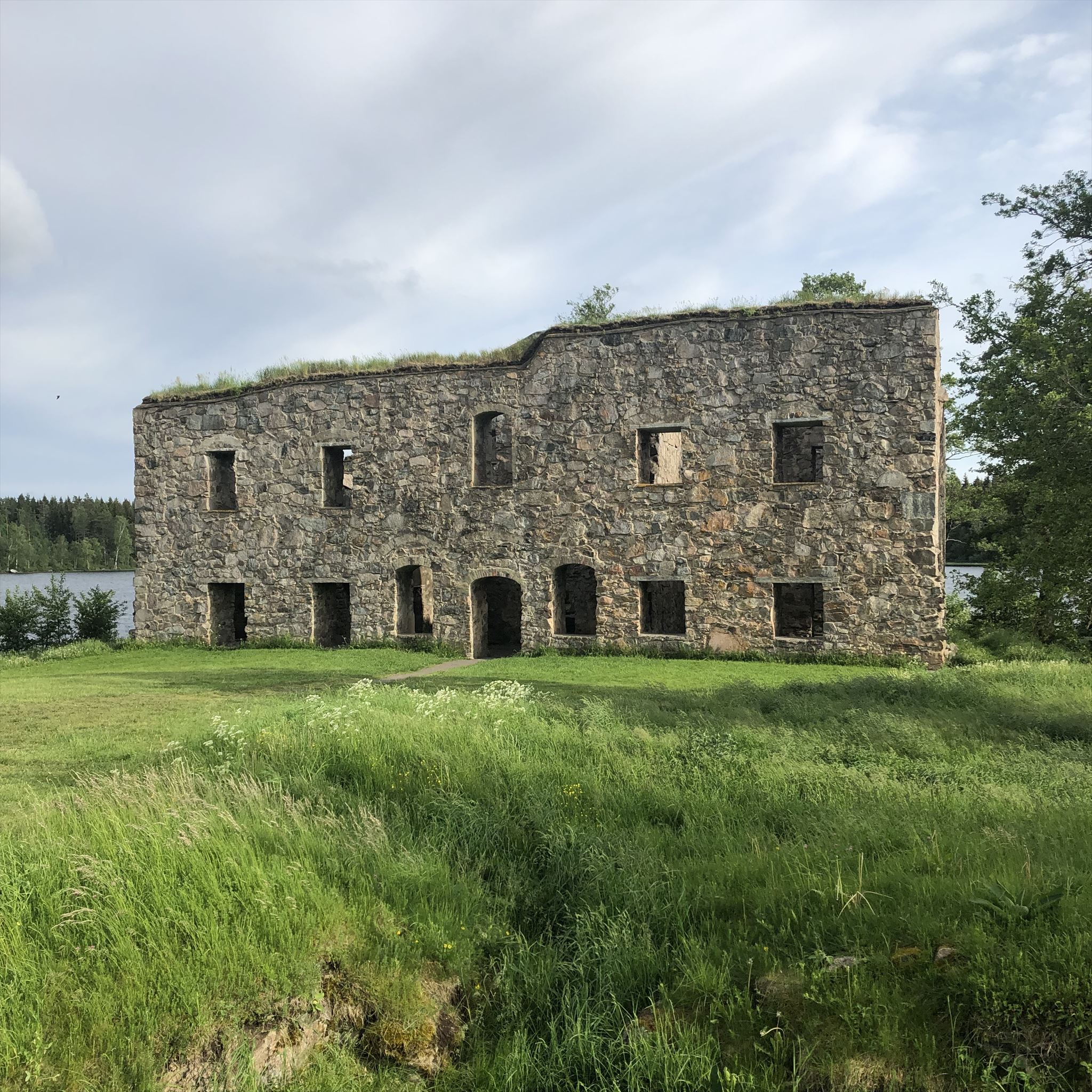 Eksjöhovgårds slottsruin Med ett romantiskt läge på en ö utanför Sävsjö ligger ruinen efter slottet Eksjöhovgård. Den lilla ön var centrum i ett av Smålands största godskomplex, som vid medeltidens slut omfattade 43 gårdar i 13 socknar. Godset innehades då av den berömda Stureätten. Den dåvarande gårdsbebyggelsen bestod sannolikt endast av trähus. Stenhuset, dagens ruin, är ett minne av stormaktstidens hö- gadliga byggprojekt; påkostade satsningar som strandade på grund av verklighetens knappa resurser. Det var en av fältmarskalkarna från 30-åriga kriget, sedermera riksrådet Karl Mauritz Lewenhaupt, som före sin död 1666 lät påbörja bygget av ett kvadratiskt stenhus i tre våningar med en altan högst upp. Andra våningen var tänkt att användas enbart för festligheter. Förlagorna till huset kom från Stockholm och tanken var att skapa en symmetrisk byggnad. Men verkligheten kom ifatt i och med 1680-talets reduktion, varvid Lewenhaupts ättlingar förlorade stora delar av godset. Resten såldes år 1700. Då hade huset med nöd och näppe fått sitt branta tak med altan. Inredning och fönster saknades, likaså fasaddekorationer. Symmetrin i fasaderna haltade också. Slottet stod tomt till 1730-talet då den nye ägaren, Magnus Julius De la Gardie lät riva översta våningen och förändrade rumsindelningen samt flyttade in köket från en av flyglarna. Ett antal rum färdiginreddes, men det är oklart om slottet någonsin blev bebott före De la Gardies död 1741. Härefter började slottet förfalla och efter att taket av kopparplåt tagits ner 1812 gick det snabbt. När ruinen konserverades på 1930-talet var den i mycket dåligt skick och hela södra fasaden hade rasat. Sedan dess har ruinen varit föremål för återkommande vårdinsatser, senast 2009. Som ett hundraårigt byggprojekt var Eksjöhovgård ett misslyckande, men som stämningsfull ruin är slottet ett intressant besöksmål och en stark symbol för orten. ************************************************************************************* För att logga denna Virtuella geocache ska du ta ett foto på dig eller din GPS eller ditt nickname med borgen i bakgrunden, Ny bro är på plats så nu kan ni gå över och titta på det som finns kvar.***********************************************************************************