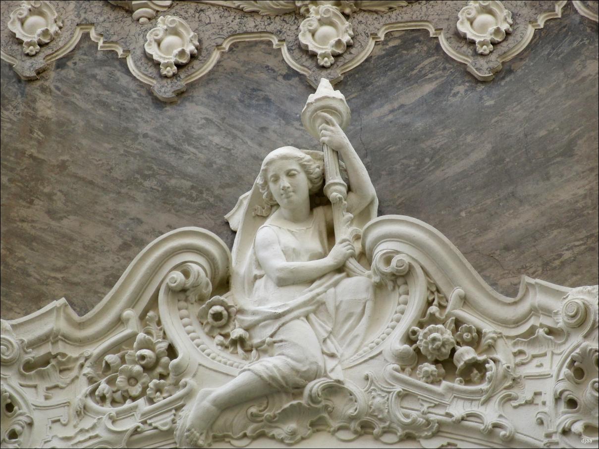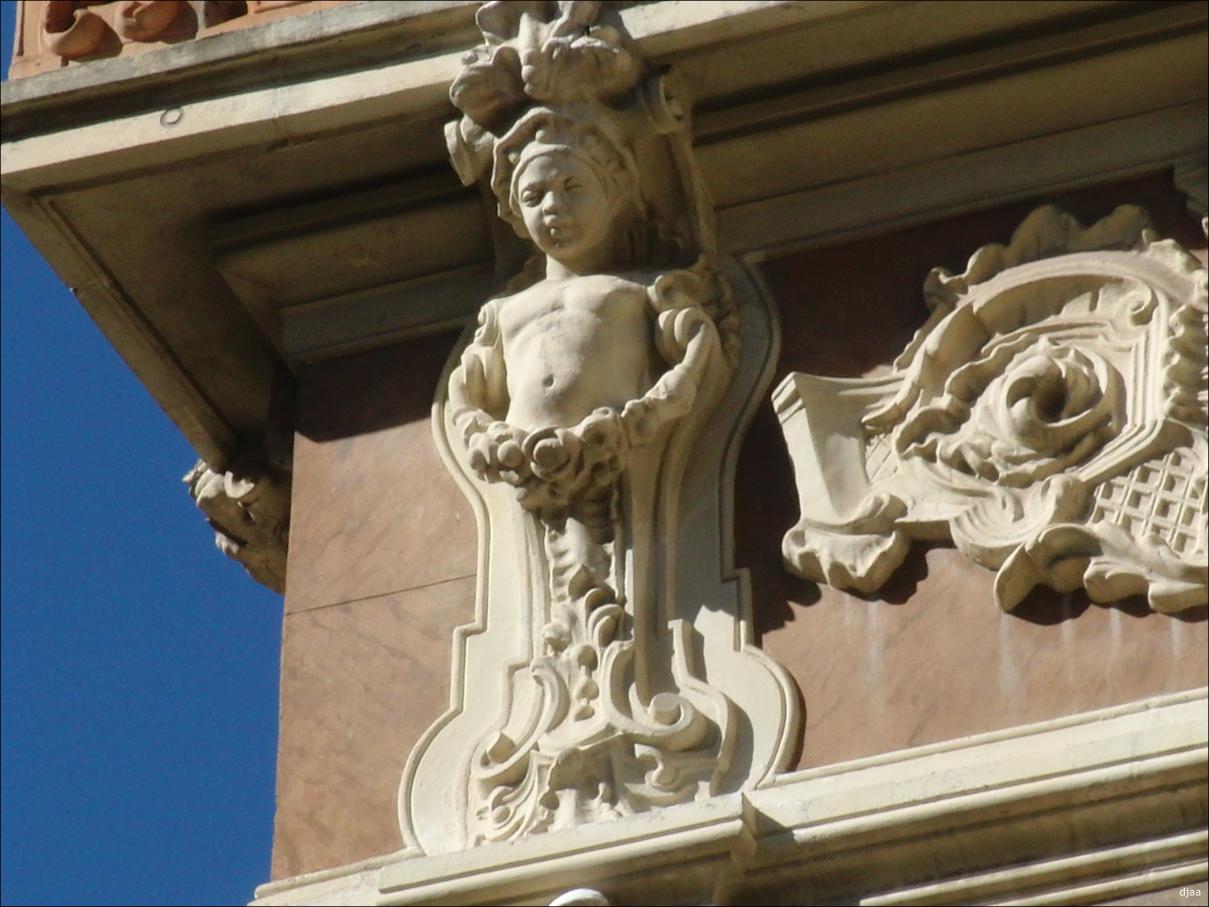 En un tercer nivel y en la parte más alta de los balcones del segundo piso seis medallones con bustos de diversos dioses: Apolo, Atenea, Dionisio, Flora, Deméter y Helios.