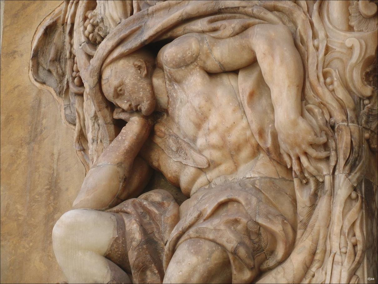 En el lado izquierdo, un león recostado, otra vasija derramando agua y otro carcaj con flechas. Sobre el lomo del león descansa el pie del otro gigante. Completa el conjunto diversa decoración de tipo vegetal y una palmera.