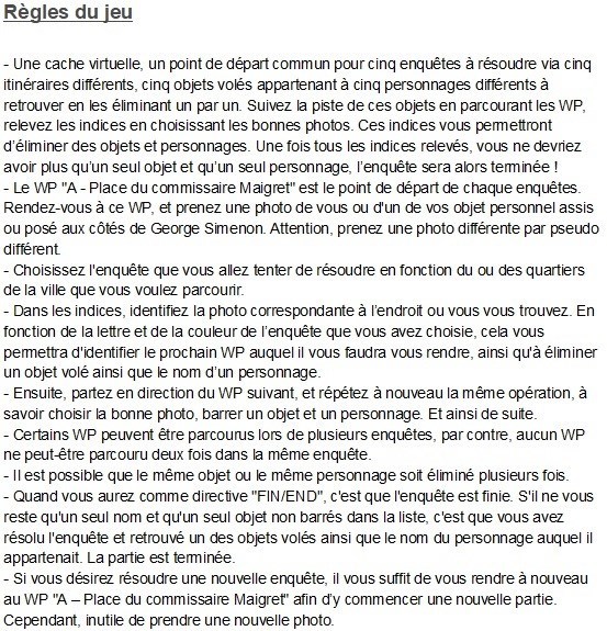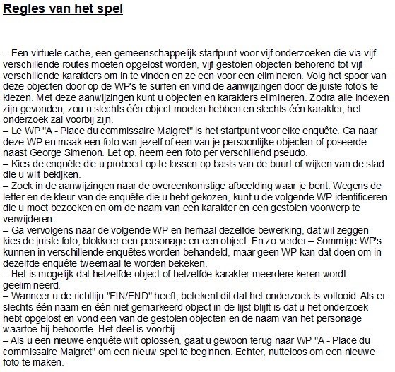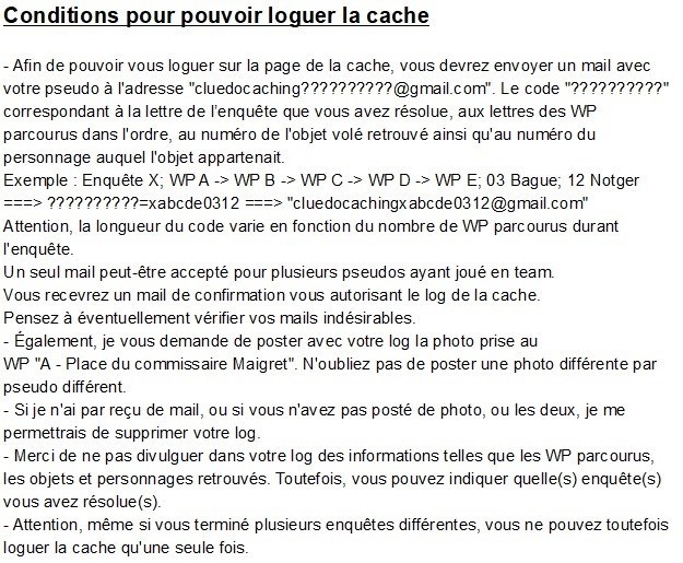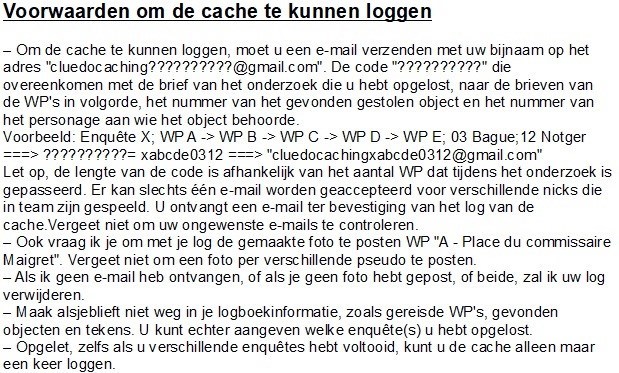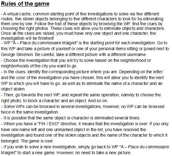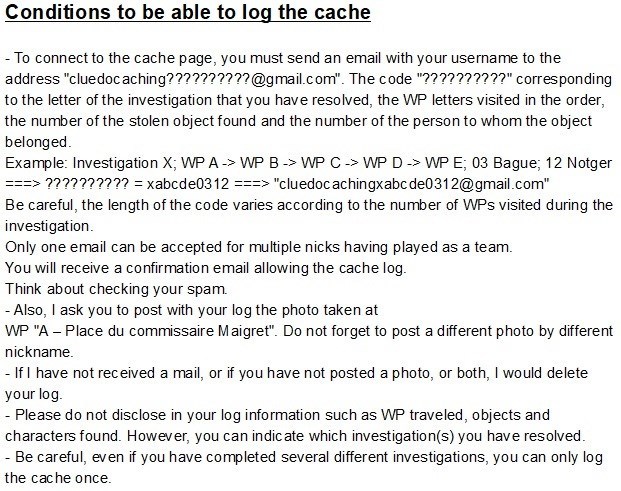 Avec cette cache virtuelle, partez à la (re)découverte de Liège tout en participant à une ou des enquêtes inspirée(s) du jeu Cluedo. Les règles du célèbre jeu de société ont ici été adaptées afin de coller à celles du geocaching.