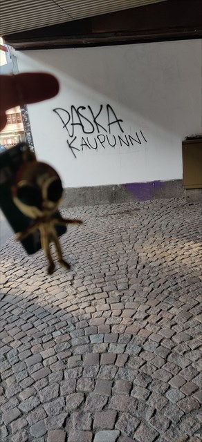 "Paska kaupunni" is a graffiti on the wall of Valkealinna building at Uusikatu 22. The text is in Finnish and means "shitty city". It appeared for the first time in the 80's and since then it has been periodically removed but it always comes back. The text has become meaningful to the people of Oulu and we have also branded some products like beer and coffee with this name.