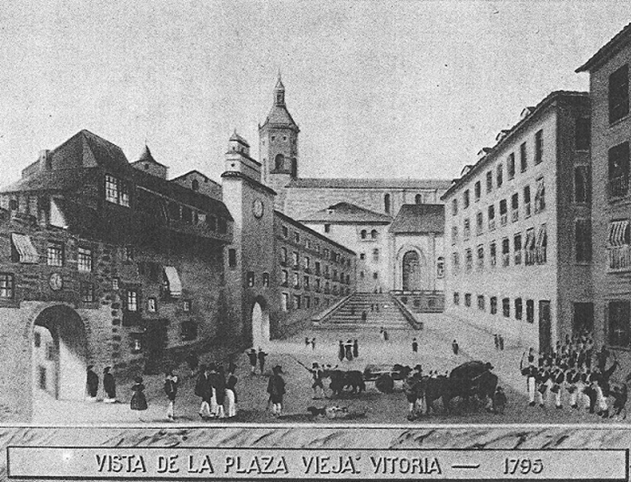Al parecer, la denominación de Plaza Vieja o Plaza Vieja de Castilla estaba más extendida entre la gente de Vitoria, y, además, como solía servir de mercado, ese “mercado” también pasó a formar parte de la relación de nombres que ya coleccionaba este lugar en pleno siglo XIX. Es curioso, no obstante, además de saber que esta Plazuela del Mercado era más grande que la actual Plaza de la Virgen Blanca, que algunas de las mercancías que se comercializaban en dicho mercado, dieron nombre a ciertos rincones de la plaza. Por ejemplo, “las Alubieras” y “las Olleras“.