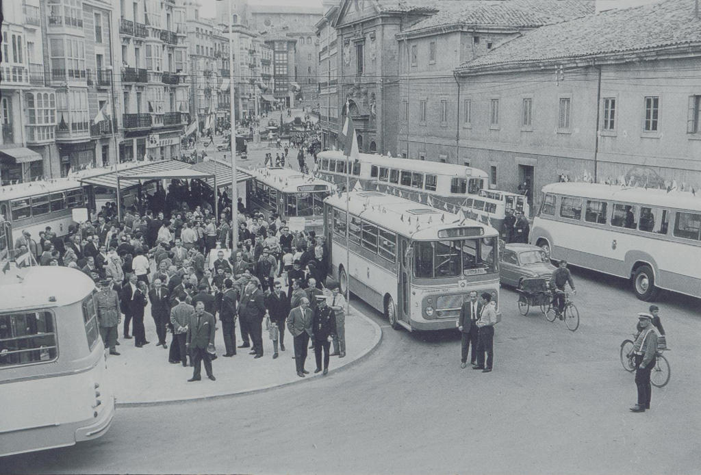 La plaza era el punto de partida de las diversas líneas de autobuses que recorren la ciudad. Aquí se ven a tres unidades esperando el momento de salida poco antes de una de las horas llamadas puntas.