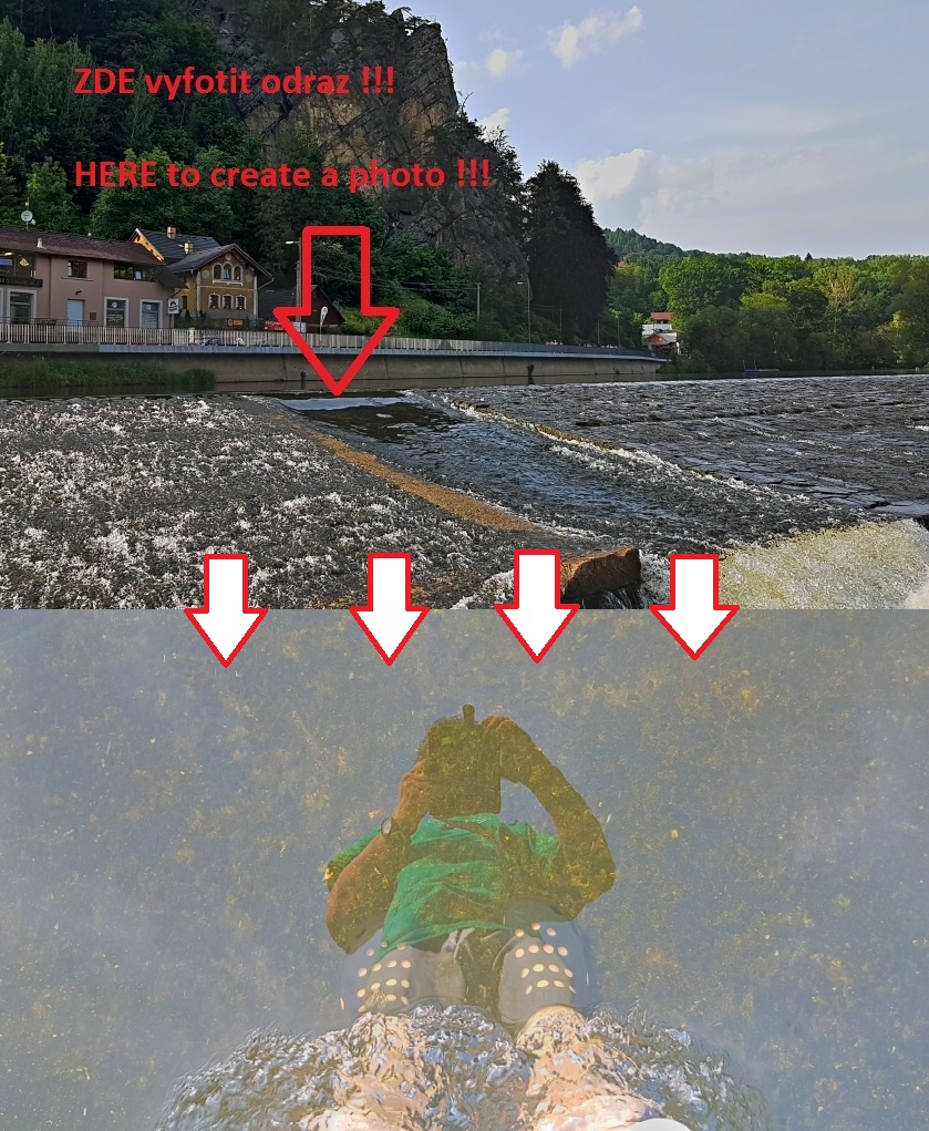 On the second picture should be your reflection on the water surface with your feet directly at the middle of the weir beginning of the weir´s „raft pass“ by photos. So you have to enter the stream of water through which raft pass and stand in the middle !!! Therefore the terrain of the cache is rated T4 *