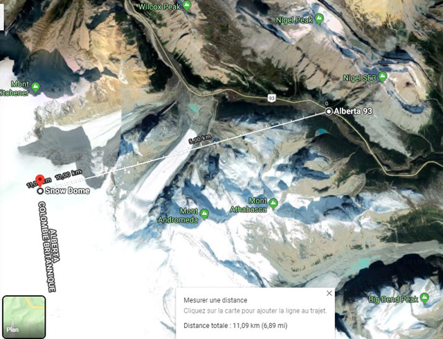 Vous faites également face au Snow Dome. C'est une montagne située sur la ligne de partage des eaux continentale de Columbia, où les limites du parc national de Banff et du parc national de Jasper rejoignent les frontières de l'Alberta et de la Colombie-Britannique au Canada. L'altitude du sommet est de 3 456 m.