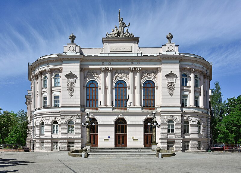 Gdyby jednak nie wiedzieć, do czego służy budynek, a także nie przyglądać się bliżej zdobieniom, nie byłoby łatwo stwierdzić, że jest to siedziba wyższej uczelni technicznej. Na myśl przyszedłby raczej jakiś pałac, może teatr? Ale dokładne zwrócenie uwagi na detale rozwiewa wątpliwości – ten budynek służy nauce i technice. Widzisz dwie tablice z latami rozpoczęcia i zakończenia budowy? Pod nimi znajduje się rzeźbiona dekoracja z motywem roślinnym, w który jednak wplecione są koło zębate, młotek, ekierka i inne techniczne atrybuty. Płaskorzeźby nad trzema oknami przedniej ściany również są wielce wymowne.