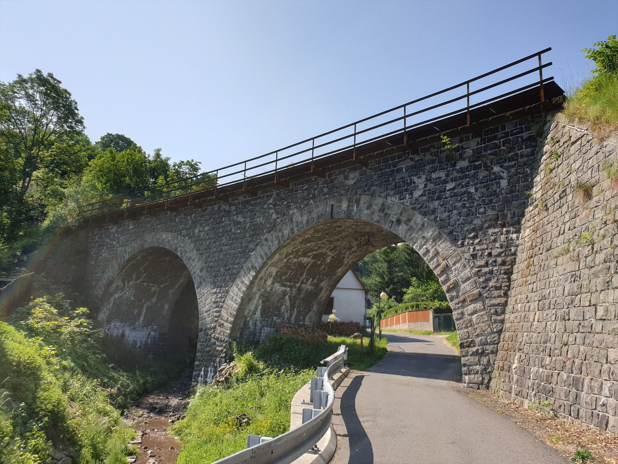 Most byl uveden do provozu 29. 8. 1903. Je dvouobloukový, zhruba 24 metrů dlouhý se zachovaným kolejovým polem. Mezi kameny dochází k protékání vody a tím ke srážení minerálů. Železniční doprava na mostě byla zastavena v roce 1979 a od té doby pouze chátrá.