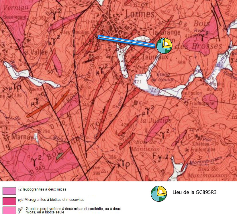 μγ2 . Microgranites à biotite. Les filons de microgranite du secteur de Lormes s'étendent sur plusieurs centaines de mètres de longueur et leur épaisseur atteint 50 m. Ils sont généralement verticaux. Les microgranites recoupent principalement les granites. Ce sont des roches roses, à phénocristaux (1 x 2 à 2 x 3 cm) plus ou moins abondants de feldspath potassique, à cristaux (1-10 mm) automorphes de quartz, d'oligoclase et de biotite. Le fond est souvent aphyrique (cristaux visibles à l’ œil nu), finement recristallisé ou parfois micrographique.