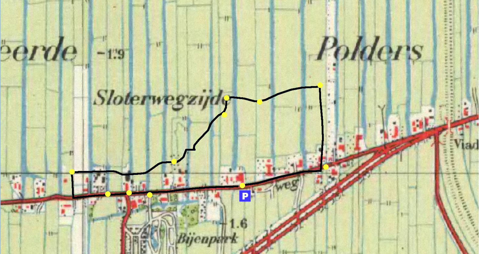 Kaart van de Sloterweg rond 1950 met de waypoints van nu.