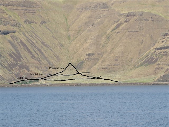 Proximal fan is the apex where the slope is the greatest, the stream or canyon is the narrowest. This is where the largest gravel and boulders may be found.