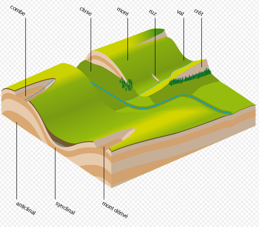 "Le relief jurassien est un relief de plissement correspondant à un ensemble de formes qui se retrouvent dans les régions sédimentaires où les couches de roches sont fortement redressées ou plissées. L'érosion y est particulièrement forte dans les parties hautes qu'elle peut alors évider.