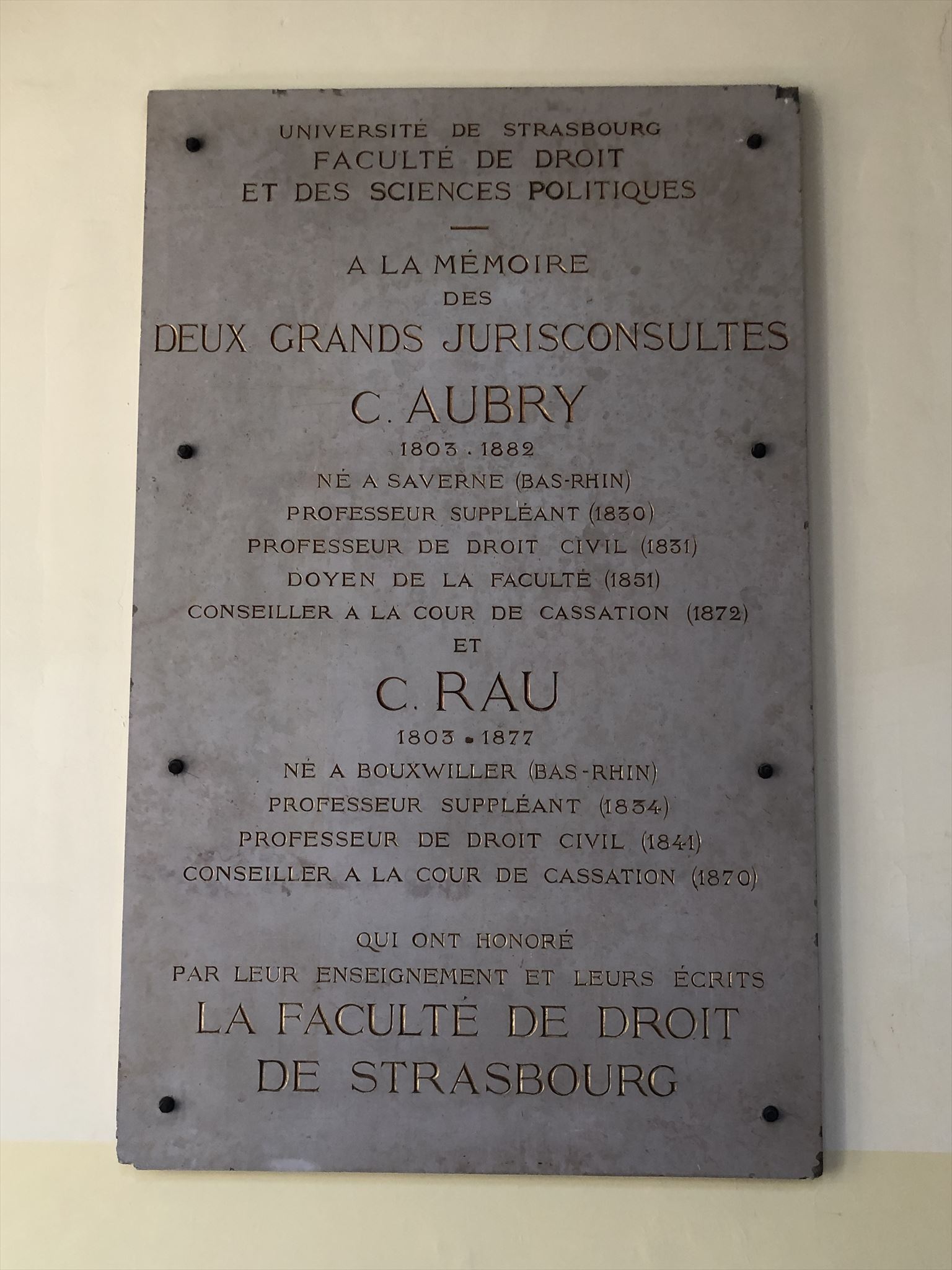 Tous deux professeurs à la Faculté de droit de Strasbourg, Aubry et Rau, entament une collaboration d'une quarantaine d'années, suivie d'une de publications de doctrine et de commentaires de jurisprudence. Leur complicité dominera l'évolutiondes idées à la Faculté de droit à Strasbourg durant l'ère du Second Empire : le principe de l'époque trouve dans le droit les fondements qui doivent résister au temps et dans la pratique juridique les bases de l'armature sociale.