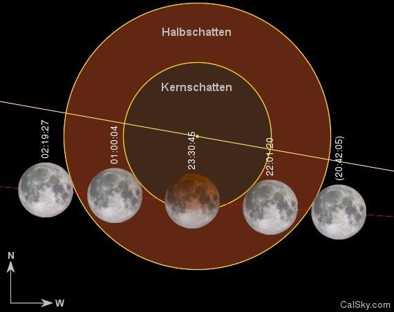 Zur Mitte der Finsternis gegen 23.30 Uhr MESZ liegen knapp zwei Drittel der Mondoberfläche im Erdschatten.