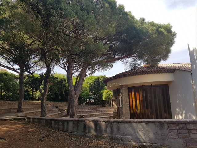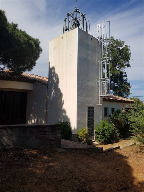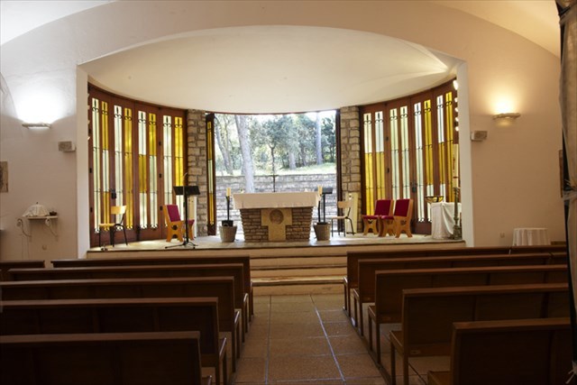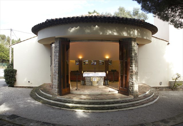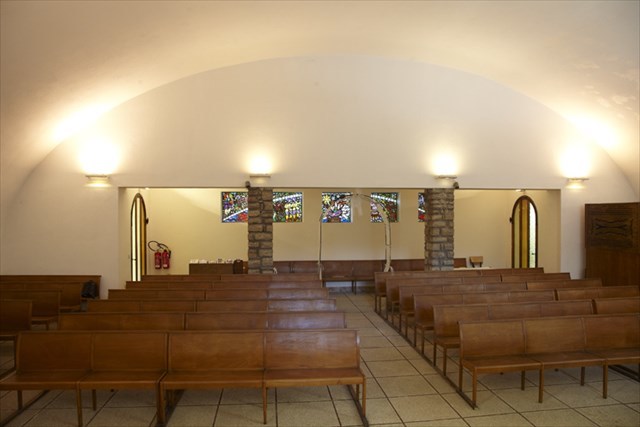 La chapelle juste au-dessus, est dotée de grandes portes vitrées coulissantes en demi-cercle laissant entrevoir son choeur afin de pratiquer les offices en direction d'une assistance assise sur six rangs de gradins à l'extérieur. La chapelle peut donc se transformer en chapelle d'été.