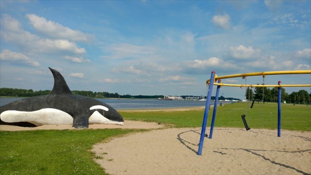 Tussen de voetbal velden van Bunschoten-Spakenburg en de jachthaven ligt aan het Eemmeer het recreatie strandje 't Kleine Zeetje.