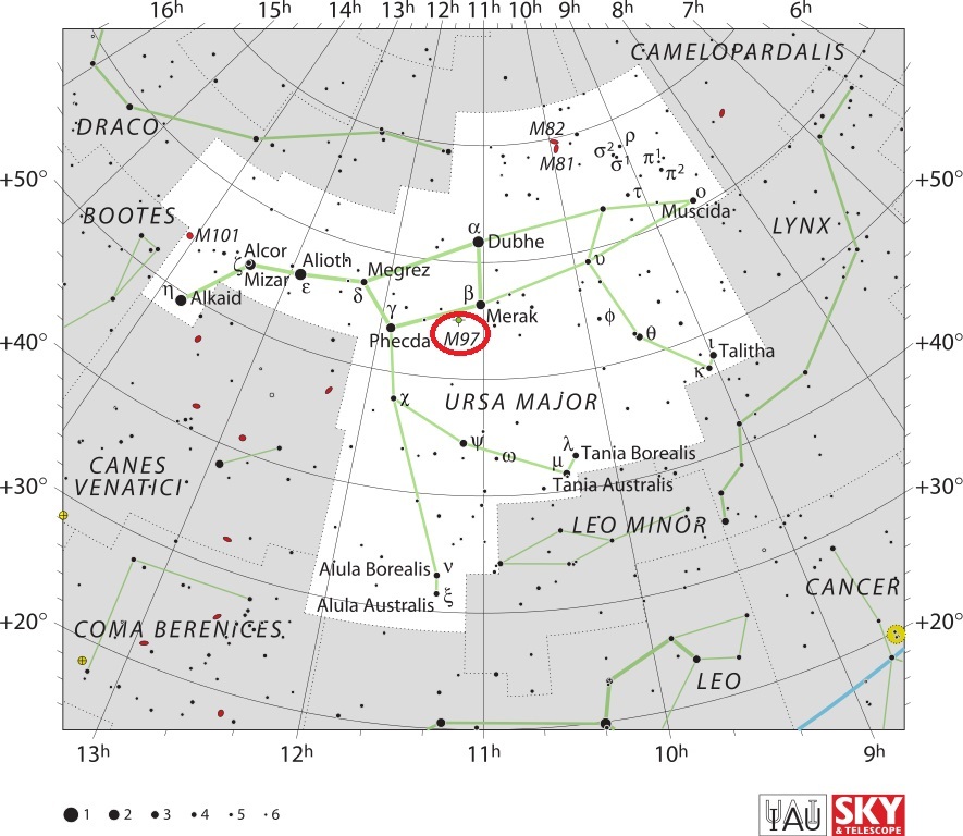 Messier 97 (M97), also known as the Owl Nebula, is a famous planetary nebula located in Ursa Major constellation.