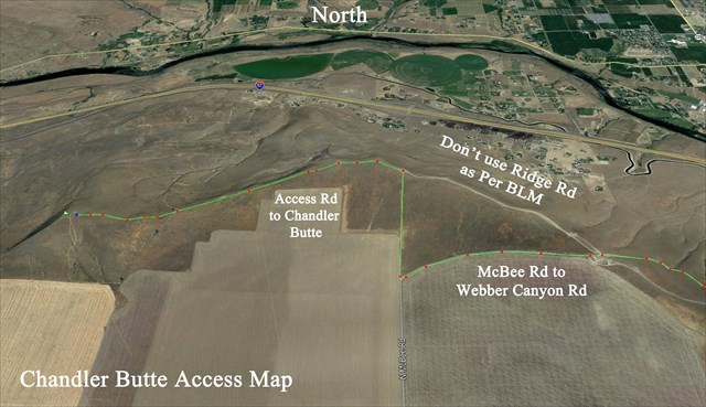 Chandler Butte and Horse Heaven Hills are a mix of public (BLM) and private lands. Visitors need to be aware of property boundaries and to avoid trespassing on private land near communication Towers and farms. Webber Canyon Road to McBee Road is the best road to access the east side of Chandler Butte and associated Ridges. Don’t access Chandler Butte across ridge road as noted on provide map. Please note that other roads in the area may not be public (BLM or county) roads, and access is by permission only. There are a number of roads and trails that crisscross BLM-managed lands on the south and west side of the Chandler Butte. Please stay on existing roads and trails and practice Tread Lightly principles: