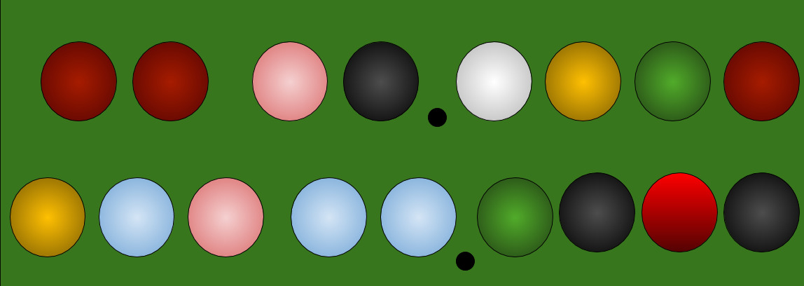 You step into the Billiard Room where a full sized slate snooker table occupies pride of place in the middle of the room. Looks like there were a few games of snooker here last night - perhaps money changed hands, could that be a motive for the crime that took place? You look closely at the balls arranged on the table.