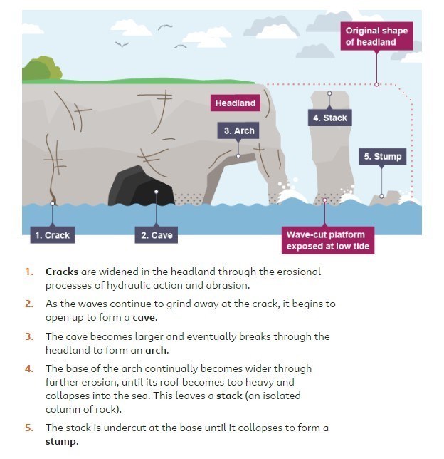 Tidal action continued to erode the soft sandstone along the shoreline. Surface water, filtering down through the vertical cracks in the cliffs, wore material away from the top gradually separating a large block of rock from the adjoining cliffs. This isolated column of rock became a sea stack or flower pot.