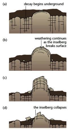 Un clima tropical intensifica el clima, lo que resulta en la liberación y contracción de las capas externas de las rocas, posiblemente agrietándose y pelando como capas de una cebolla en un proceso llamado descamación. Así se deja proyectando la roca resistente.