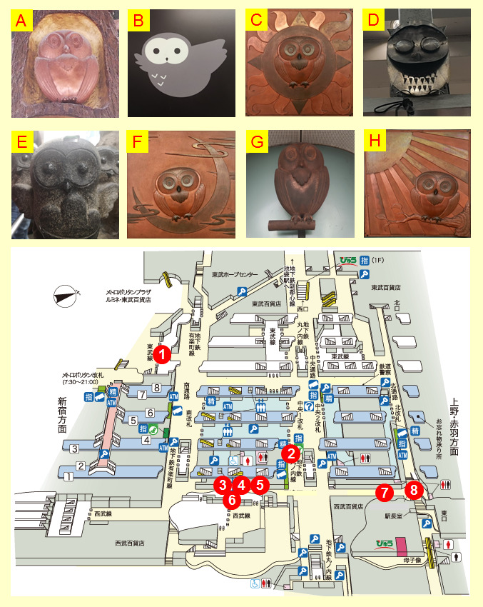 The listed coordinates indicate the Ike-fukuro (pond owl) statue, a stone statue of an owl in Ikebukuro Station. The cache is not hidden at the listed coordinates. Please find owls in photo [A] to [H] in Ikebukuro Station. The actual cache coordinates are displayed by entering a character string in which alphabets corresponding to the owls in (1) to (8) in the map are arranged in order as a keyword in the answer verification site (Certitude). Please bring your own pen. ===== Japanese ===== 公開座標は、池袋駅構内にある「いけふくろう像」を指しています。公開座標にキャッシュはありません。 写真[A]から[H]のふくろう達が、池袋駅構内のどこにいるか探してください。最終座標は、地図の(1)から(8)に対応するふくろうのアルファベットを順に並べた文字列を、解答確認サイト(Certitude)にキーワードとして入力すると表示されます。キャッシュにはペンが入っていませんのでお持ちください。