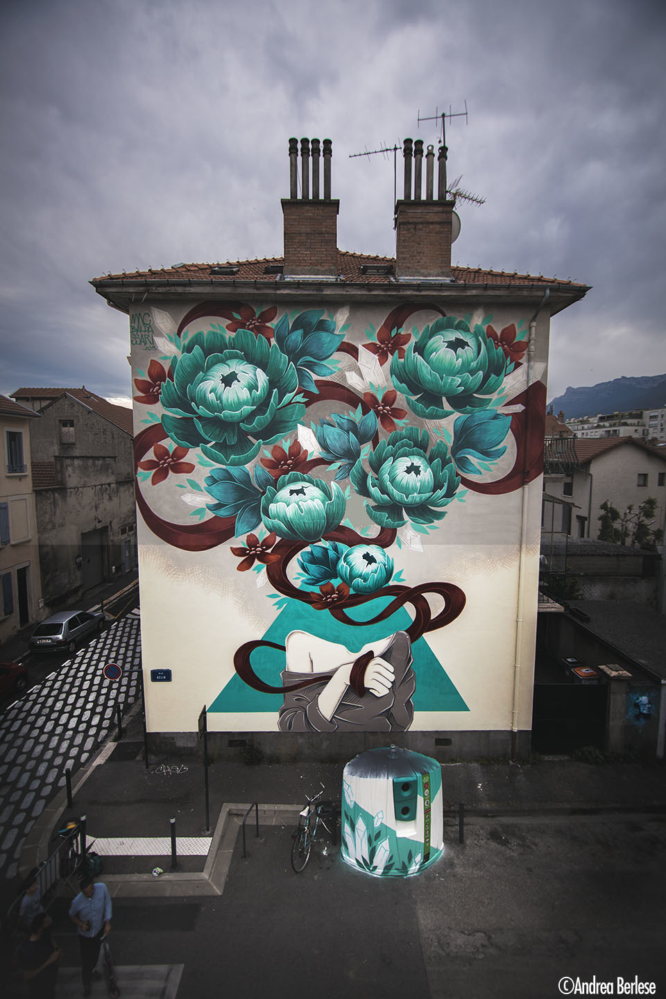 « Ma murale questionne la place et l’importance de la vie végétale au cœur des agglomérations. Avec le grandissement constant de la population, le développement et l’étalement urbain, l’asphalte et le béton s’étalent sans cesse au dépit de la végétation.