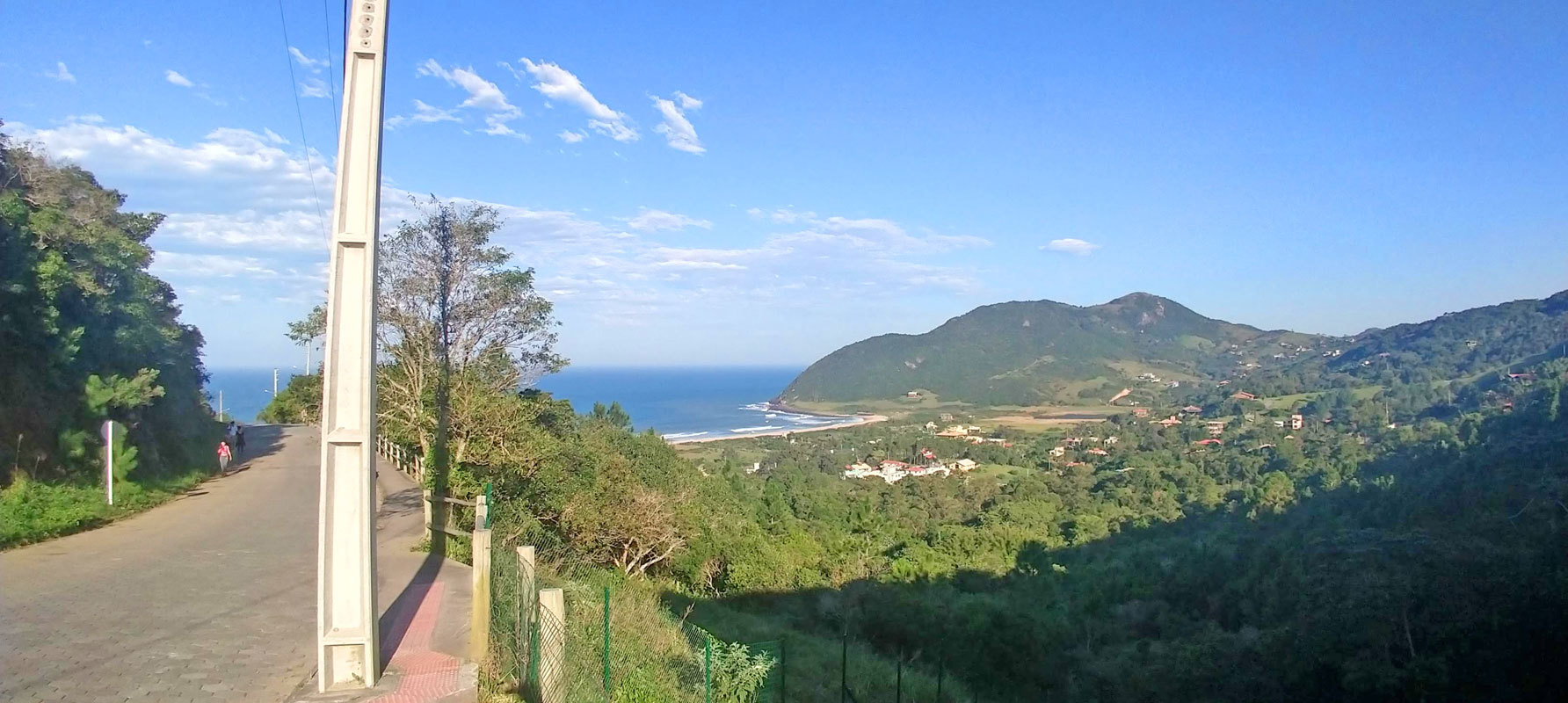 Na esquerda da estrada, lado norte, você vê o afloramento rochoso do granitóide Paulo Lopes, com mais de 600 milhões de anos e ali exposto junto aos neossolos no barranco. Do outro lado, na direita uma vista que permite contemplar o canto sul da praia do Silveira (na década de 1960 era denominada de Prainha do Silveira). No fim da praia a ponta do Costão do Sul que é borda do Morro Alto ou do Capão como é conhecido pelos locais, que encobre da vista o Costão das Cobras e o morro do Ferrugem na praia da Ferrugem, distante em linha reta mais de 4 quilometros. Se acompanhar a paisagem você vai ver também uma pequena laguna no canto sul. E os olhos mais atendos vão ver os surfistas e no inverno as baleias francas.