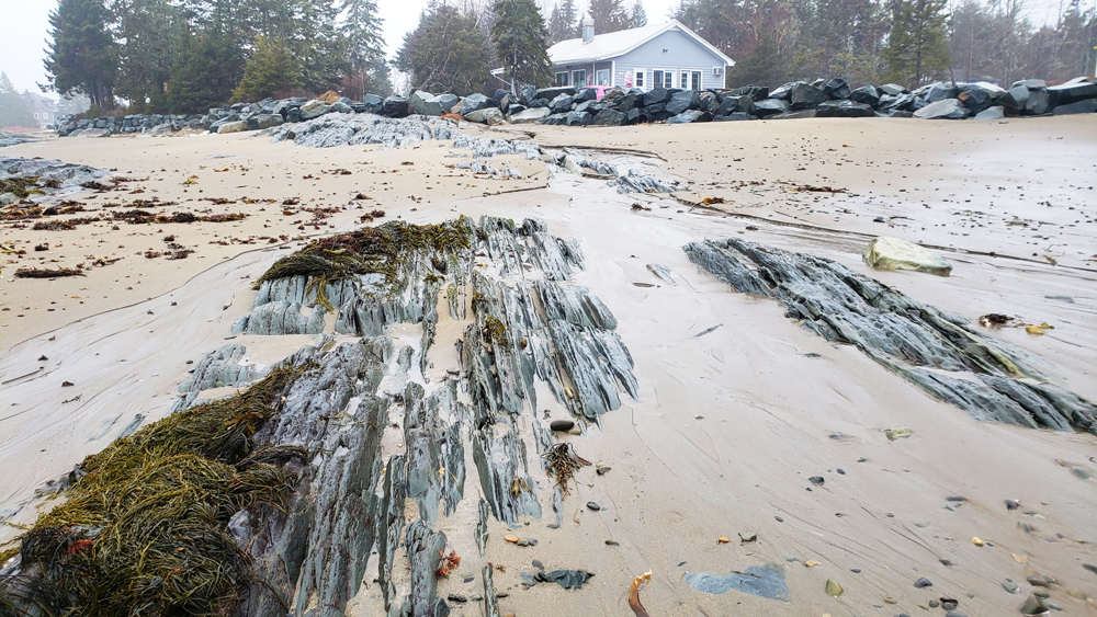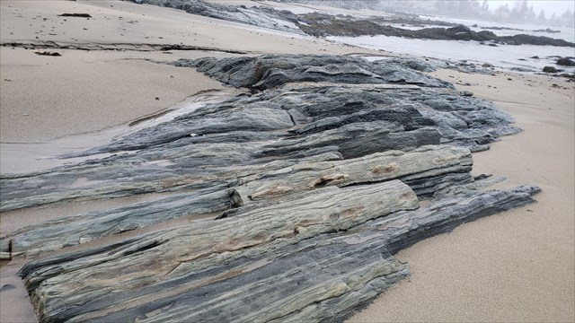 The beautifully sculpted outcrops were deposited by turbidity currents travelling with medium-energy flow. Layers like these became thicker and more common in Meguma around the middle of the Cambrian period, one sign that the environment was slowly changing.