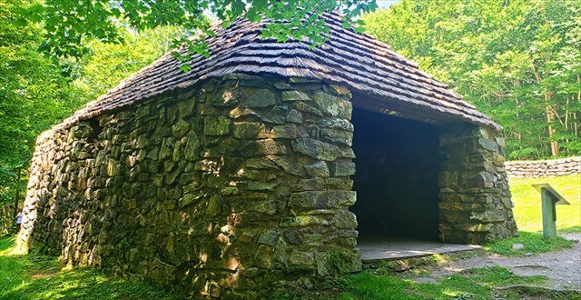 The walls of the Lone Shieling and the low wall enclosing its grassy surrounds are both made from local stones, including those of the Blair River Inlier.
