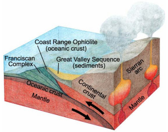 The San Andreas fault system is a relatively new geologic feature in the Bay Area; originating to the south 28 million years ago, but extending through the Bay Area only 6-10 million years ago. In contrast, older rocks of coastal California indicate that, before the Pacific Plate started slipping northward past the North American Plate on the San Andreas fault system, the Pacific ocean floor was subducted (moved) beneath the western edge of the North American Plate. The distinctive rocks of the world-famous Franciscan Complex, named at San Francisco and underlying much of coastal Northern California, formed in this subduction zone. In the Bay Area, rocks of the Franciscan Complex form the basement for the Coast Ranges east of the San Andreas Fault. The Franciscan rocks range in age from about 200 to 80 million years old. They represent an accretionary wedge, a complex body of rock that accumulates in a subduction zone. Rock types are primarily greywacke sandstone and argillite shed off the continental margin, but also contain lessor amounts of greenstone (altered ocean floor basalt), deep sea radiolarian chert, limestone, serpentinite (altered mantle material) and a variety of high-grade metamorphic rocks such as blueschist (high-pressure), amphibolite and eclogite (high-temperature). These rocks are typically highly fractured and disrupted and may be mixed together on a local scale to create what is called a mélange (French for “mixture” or “blend”).