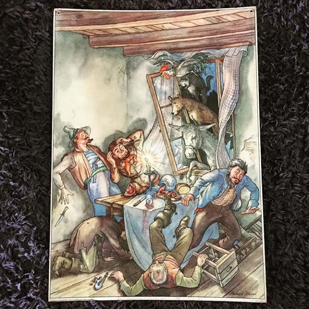 Mutta yhtenä päivänä eivät saattaneet Bremenin kaupunkiin ennättää, vaan tulivatpa illalla erähäsen metsään, jonne aikoivat jäädä yöksi. Aasi ja koira puun juurelle panivat maata, kissa ja kukko ylös puuhun puikahtivat, mutta kukko kuitenkin aina latvahan lensi, koska siellä muka oli turvallisin oltava. Ennen-kuin se nukkuakseen ummisti silmänsä, se kuitenkin vielä kerran joka taholle katsahti ympärillensä, ja olipa kukon mielestä, ikään kuin kaukaa näkyisi pieni valon-kipinä; se sentähden huusi kumppaneillensa, että lähistössä varmaankin oli joku ihmis-asunto, koska näkyi valkeaa. Tähän sanoi aasi: "nouskaamme siis, sinne lähteäksemme, sillä onhan tämä maja-paikka jotenkin huono." Koira arveli, että pari lihaista luuta sille maistuisi aivan hyvältä. Nyt sentähden kaikin läksivät liikkeelle sinne-päin, mistä valo tuli, ja pian sen näkivät paremmin loistavan sekä yhä enenevän, kunnes saapuivat kirkkahasti valaistun ryövärien-asunnon edustalle. Aasi isoimmakseen akkunaa läheni ja katsoi siitä sisälle. "Mitäs näet, Hiiro?" kysyi kukko. "No näkeehän täältä jotakin," vastasi aasi, "ompa tuolla pöytä parahinta ruokaa ja juomaa täpö täynnänsä, ja ryöväreitä pöydän ympärillä istuu, syöden sekä juoden." - "Kas tuollahan meidän vasta kelpaisi olla!" huokasi kukko. "Kelpaisipa niinkin," sanoi aasi, "mutta mitenkä sinne pääsisimme?" Sitten siinä kaikin keskustelivat, millä kurin saisivat huoneesta ryövärit karkotetuksi, ja keksivätpä viimein keinon hyvänkin. Aasi etu-jaloillaan akkunan-laudalle astui, koira aasin selkään hyppäsi, kissa kiipesi koiran niskoille ja kukko ylimmäksi lensi sekä istahti kissan pään päälle. Tämän tehtyänsä nuot kaikki yht'aikaa rupesivat jos jommoistakin ääntä laskemaan: aasi kiljui, koira haukkui, kissa naukui ja kukko lauloi; sitten akkunasta huonehesen hyökkäsivät, että ruudut pirstaleina laattiaan kilahtivat. Ryövärit tätä hirveää meteliä säikähtäen hypähtivät pystyhyn, luullen pahan-hengen tunkeuneen tupaan, sekä pakenivat pahasti pelästyneinä kiiruusti metsään. Nyt nuot neljä toveria pöydän ääreen istui, ja siinä net sitten hyvänänsä pitivät, mitä ryöväreiltä oli jäänyt, sekä söivät niin tavattomasti, kuin jos olisi neli-viikkoinen paasto juuri ollut edessä.