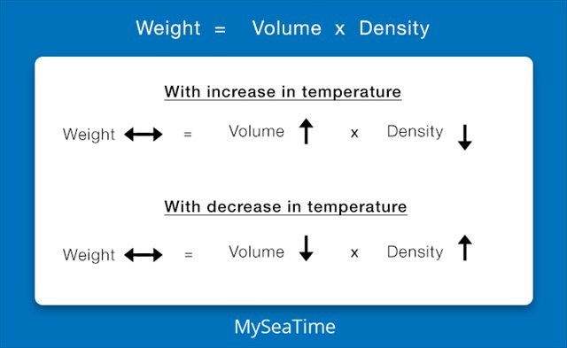 We multiply both and we get the weight of the cargo. But for oil cargoes, we are either provided with density at 15 C or API at 60 F. In this case, we need to get the volume correction factor (VCF) to convert the volume at the observed temperature to the standard volume which is volume at 15 Deg C or Volume at 60 F respectively.