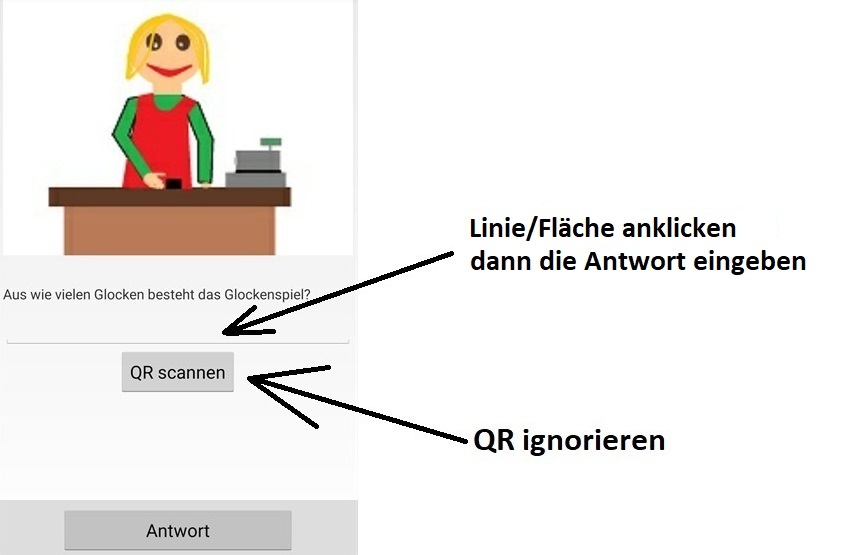 Bei der App "WhereYouGo erscheinen auf Seiten, auf denen man Lösungswörter eingeben muss auch der Button "QR scannen". Dieser Butten wird vom Programm automatisch erzeugt und muss ignoriert werden. An keiner Station kommt ein QR-Code vor. Stattdessen ist hier erforderlich, dass man auf die Linie bzw. das Feld über diesem Butten klickt, dann erscheint das Tastfeld und man kann die Eingaben tätigen.