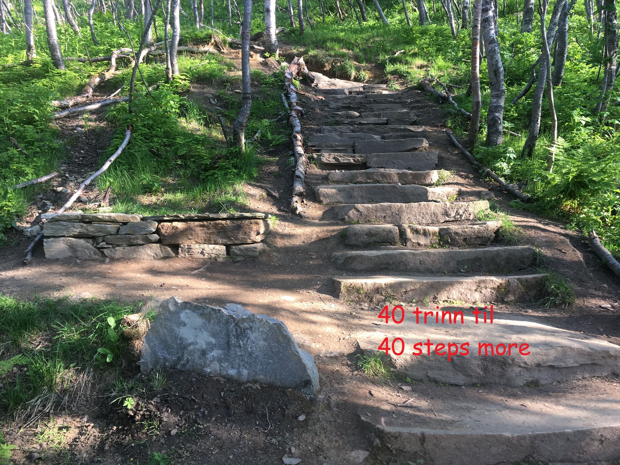 Trappa ble bygd av de nepalske fjellveiarbeidere fra Khunde Village 3840m i Nepal, et avsidesliggende område i nærheten av Mount Everest. I 2016 ble det bygd 315 trinn og i 2017 607 trinn. Til sammen har trappa 922 trinn.[1] Steinen er hentet fra Skibotn og flydd opp med helikopter, men det er også benyttet lokal kalkstein. Målet med å bygge Sherpatrappa var å minke erosjon og slitasje på stien og ta bedre vare på natur og vegetasjon. Hentet fra: https://no.wikipedia.org/wiki/Sherpatrappa