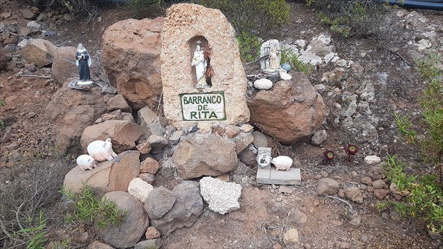 Pequeña Capilla con figuras religiosas, como se observa en el camino existen aun mas,Si continuamos por el pequeño Barranco a la izquierda de La Capilla, subimos por el Barranco y encontraremos muchas mas figuras de Santos en varias cuevitas y demas sitios.