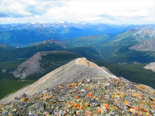 This small lock and lock is located on the 2,950 m North Summit of Mount Aldridge. Expect a probably easy scramble up the NNW Ridge with a one-way distance of 3 km and an elevation gain of 700 m from Fording River Pass.