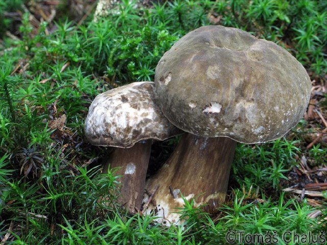 a) Hřib královský (4) b) hřib nachovýtrusý (9) c) šiškovec černý(2)