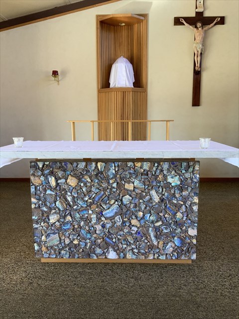 In 1976 Father John Ryan, decided to compliment the opal mining background of the area by commissioning local miner, Des Burton to install a border of opal around the carving of Our Lady of Perpetual Succour. Instead, Des offered the Priest ‘a bit of a wall’. This turned out to be almost an entire wall, which in now installed on St Finbarr’s altar, lectern and baptismal font.