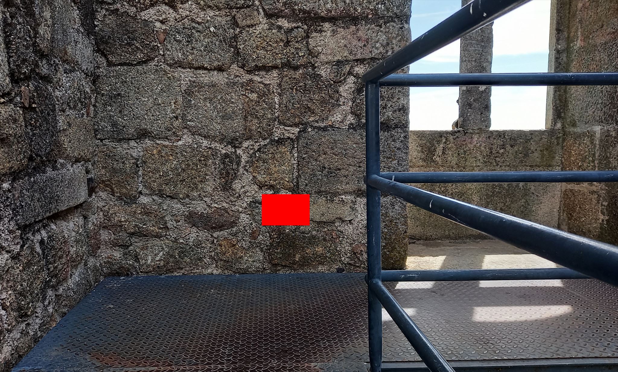 In the Tower and on the upper level. On the left side of whoever looks at the central window, on the wall and 30 centimeters from the floor, it is possible to see a sharp-shaped xenolith. See spoiler photo. The xenolith rock and the rock around it were formed by different types of magma.