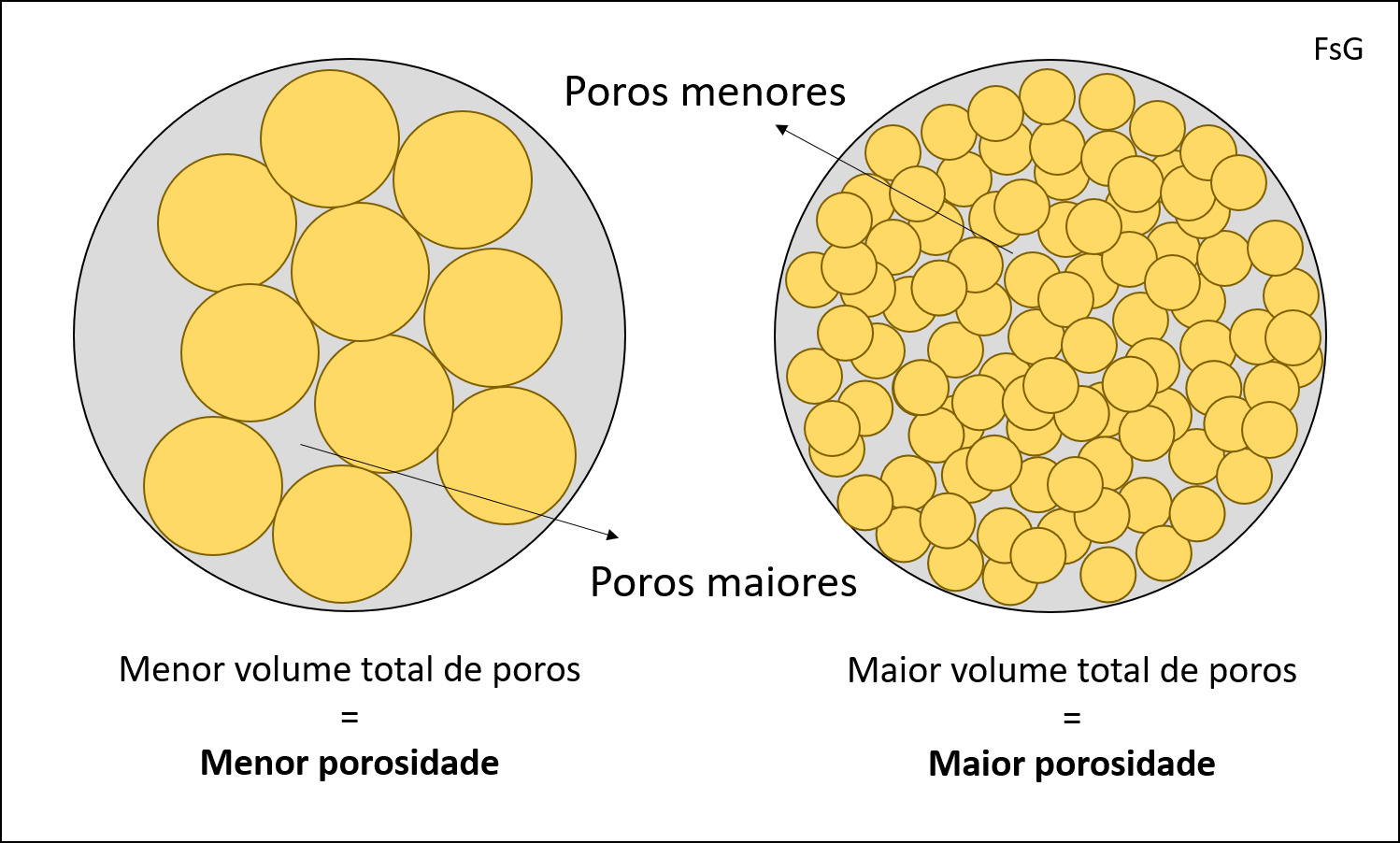 Esquema que relaciona o tamanho dos grãos com a porosidade