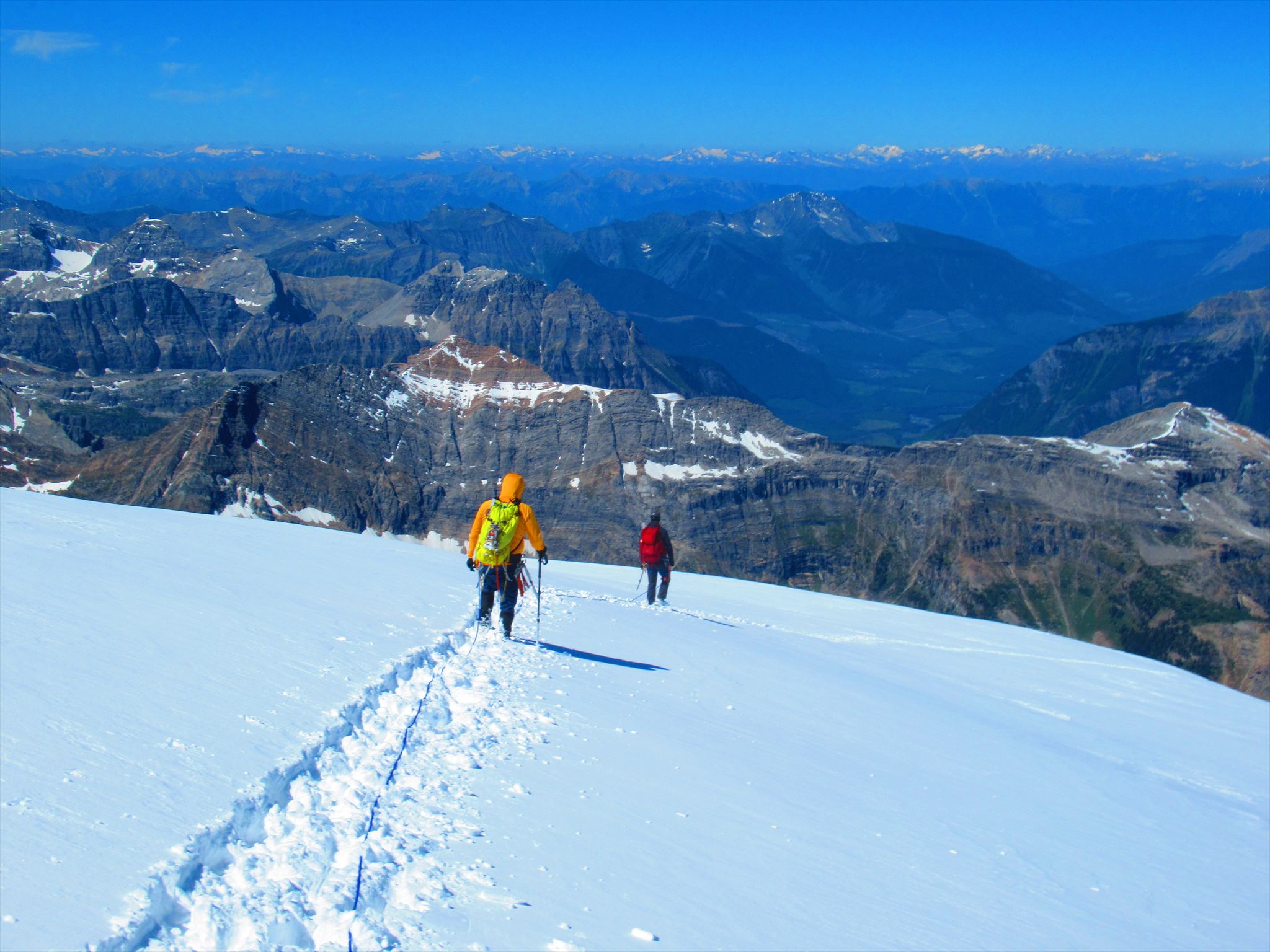 The Northeast Ridge: Follow the low-angled, lightly-crevassed glacier to just before the North Face, traverse left and go up a narrow and sometimes icy gully that splits a rock wall (some risk of rockfall). Beyond, gentler snow slopes lead to a col to the right of a subsidiary summit on the Northeast Ridge. Follow the ridge to the true summit over snow and some rock.
