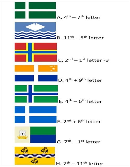 To fill in the blanks you must work out to which eight places the eight flags clues refer. You then need to do a little bit of maths: in all cases, let a=1, b=2, …, z=26.
