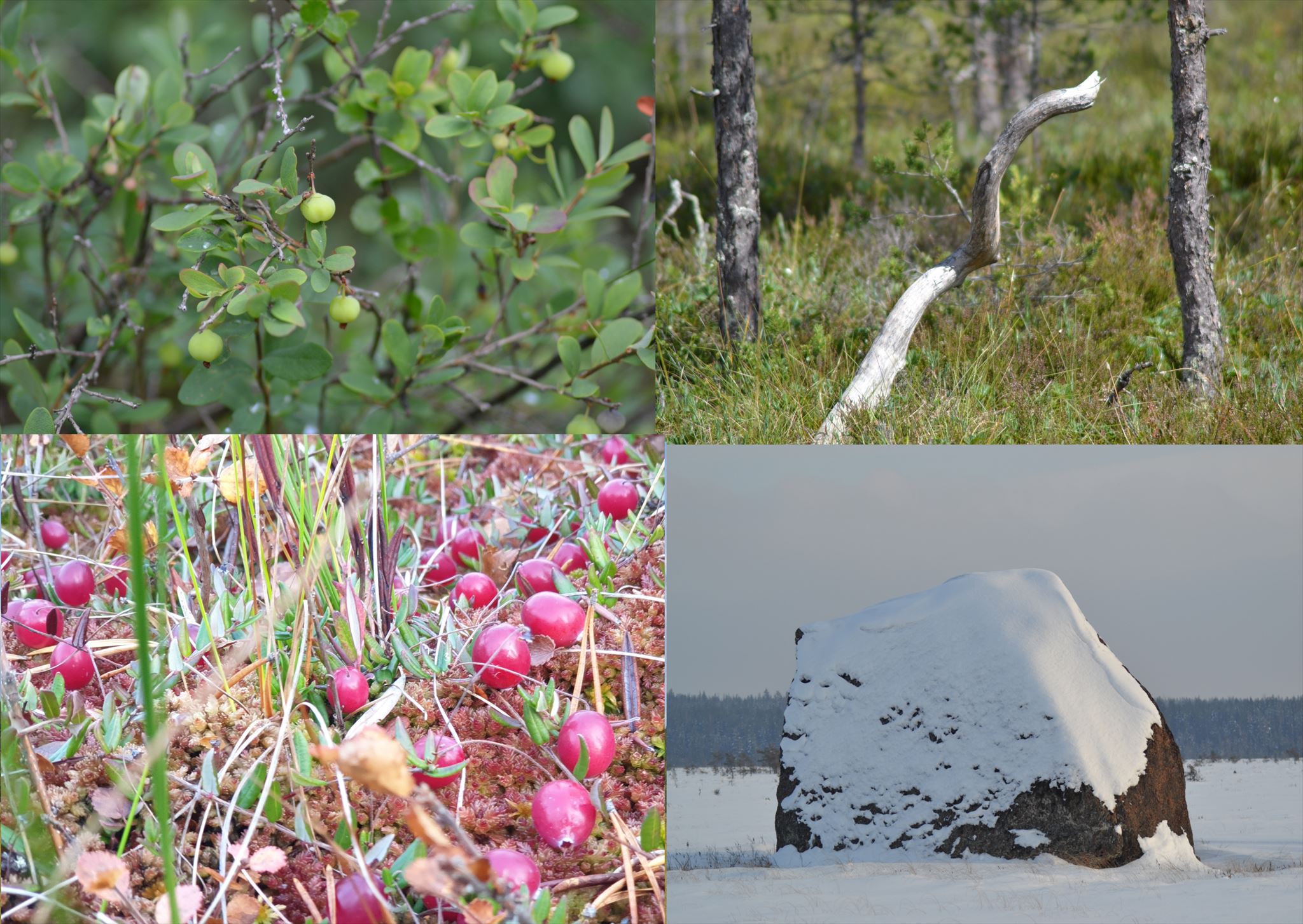 Kasviston valtalajeja ovat virpapaju, vaivaiskoivu, tupasvilla, valkopiirtoheinä, raate ja pullosara. Ja paljon karpaloita!